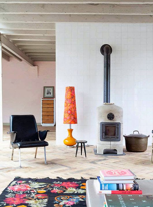 There's such a personal stamp to this incredible home. I'm loving the Tom Dixon copper shade lamps customised with neon pink chords, fantastic wood burning stoves and the black rug with the large floral print. How about you?